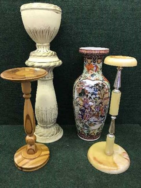 A smoker's stand, pine plant stand, jardiniere on stand and an oriental style vase