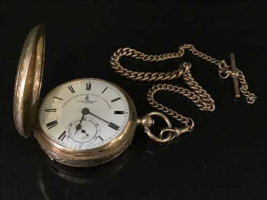 A fine 9ct gold full hunter key wound pocketwatch, the enamel dial signed John Forrest London, Chronometer Maker to the Admiralty, dial with Roman numerals and subsidiary seconds, 53mm case with ornate engine turned decoration, together with a 9ct gold Albert chain with T-bar CONDITION REPORT: Watch - 124.8g, chain - 28.8g