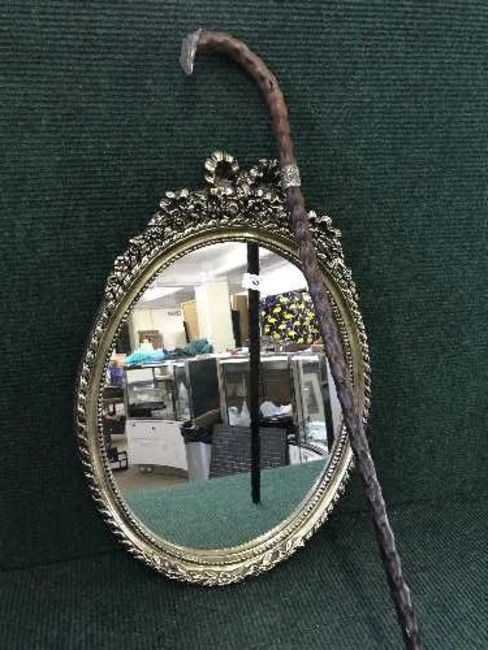 A brass slipper box, an ornate chalk mirror and a walking cane