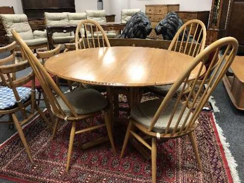 An Ercol light elm circular pedestal dining table and four Quaker Windsor chairs