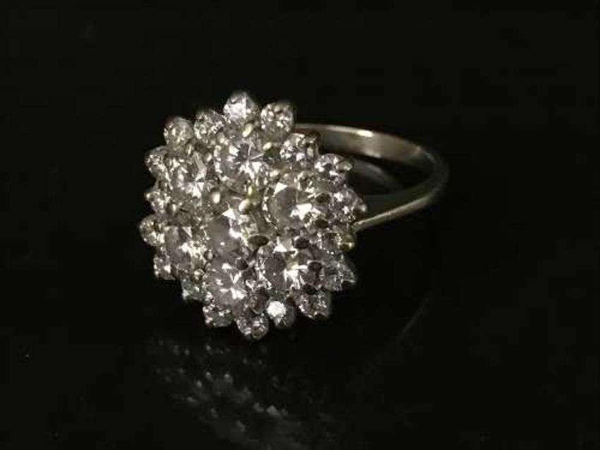 An impressive 18ct white gold diamond cluster ring, the seven larger stones weighing an estimated 2.45 carats, the others 0.9 carat (total diamond weight estimated at 3.35 carats)