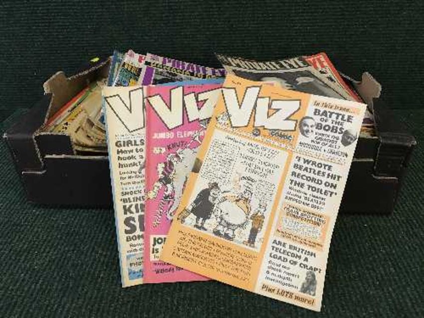 Two boxes of private eye and Viz comics, assorted books, mugs, cards etc