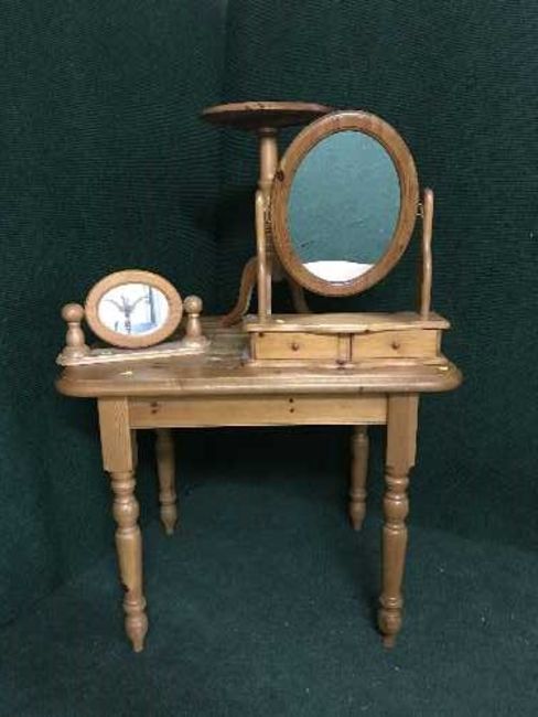 A pine kitchen table, two dressing table mirrors and a pine wine table