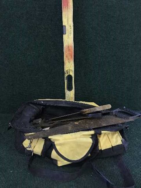 A plastic builders tub of hand tools, tool box and tools, spirit level, camping stove etc
