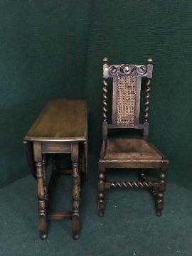 A narrow oak gate leg table together with an antique oak barley twist chair