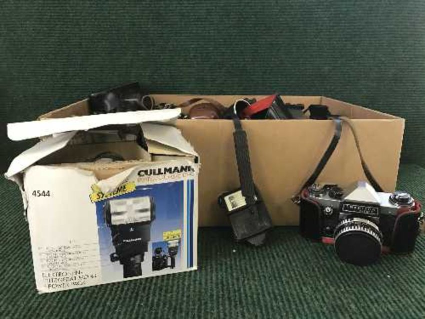 A box of cameras, flashes and lenses - Practica, Symbolica etc.