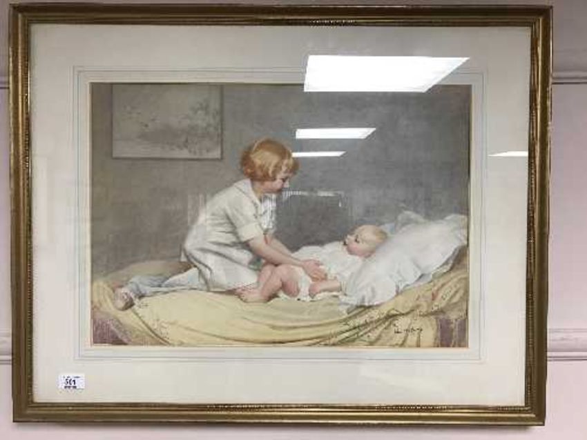 Ernest Longmate : A young child caring for a baby, watercolour, signed, framed.