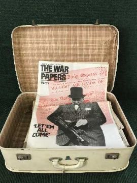 A box of figures, fruit bowl, transfer printed vases, case of War Papers Newspapers