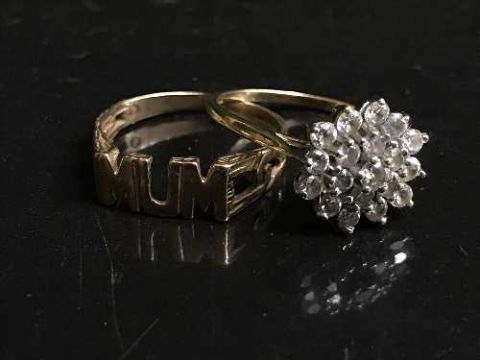 A 9ct gold and CZ cluster ring, with another 9ct gold ring