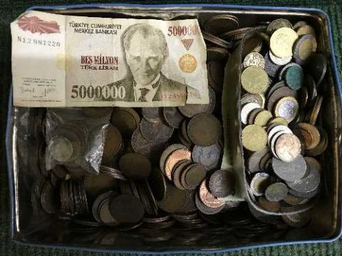 A tin of early 20th century copper coins, foreign currency etc