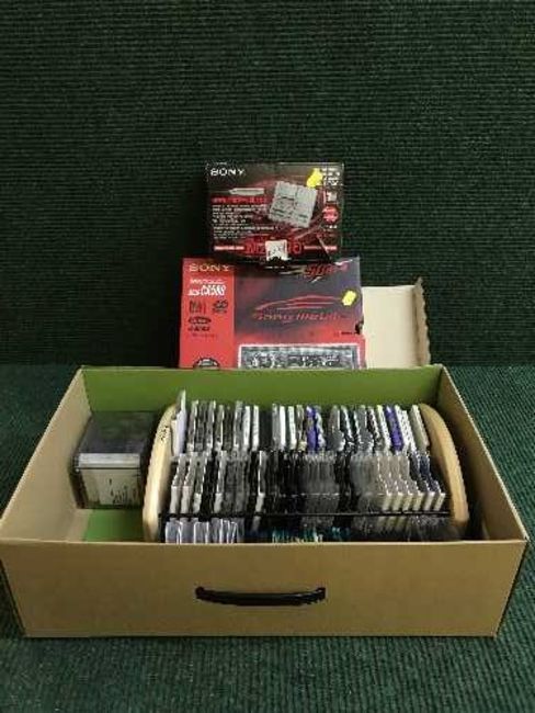 A Technics SJ-HD 501 mini disc player and a box of discs, car mini disc player etc