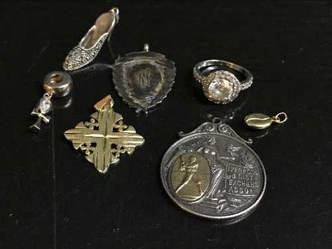 A pendant stamped 14k, a silver and gold mounted Liverpool teacher's Association medal, silver charm, silver token etc.