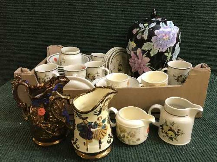A box and basket of Royal Doulton Lambeth ware dinner service, copper lustre vases, tea cup planter, lidded vase etc