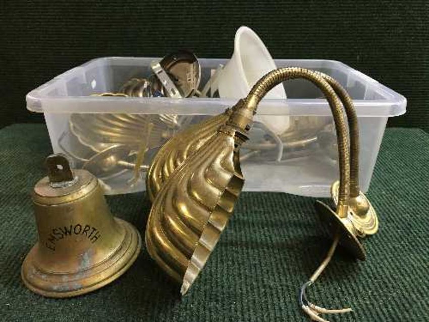 A basket of brass bell, brass angle poise shell lights, wall light with glass shade etc