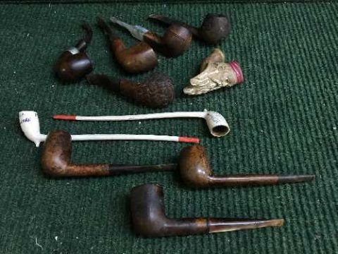 A basket of ten vintage pipes