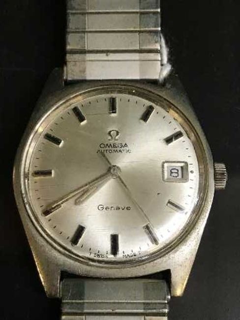 A Gents stainless steel Omega Geneve automatic centre seconds wristwatch, silvered dial with baton numerals and date aperture at 3 o' clock, 24 jewel movement numbered 29,825,740, later expanding bracelet a/f