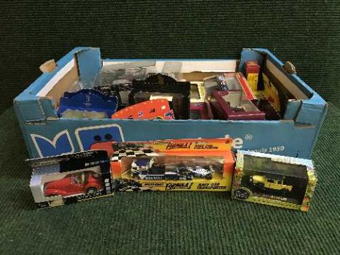 A box of assorted boxed die cast vehicles - Matchbox Formula 1 car transporter, Corgi Royal Mail delivery van, racing cars, classic cars etc