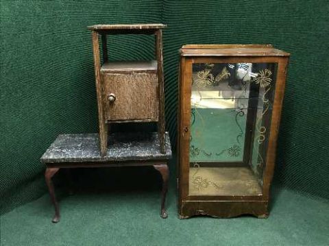 A marble topped coffee table, bedside cabinet and display cabinet