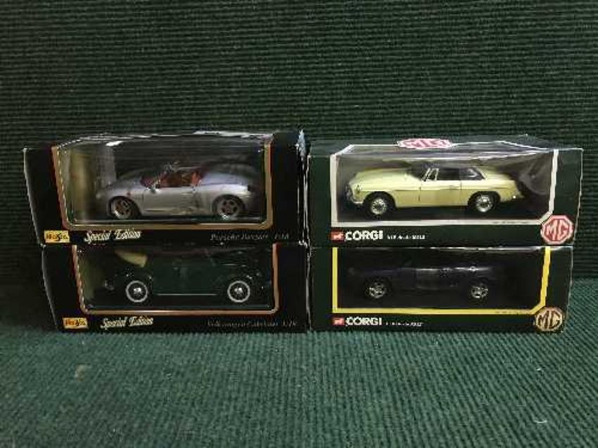 Two boxed Corgi large scale die cast vehicles - 1968 MGB Roadstars and two Maisto Special Editions - Porche Boxster and VW Cabriole