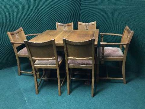 An oak extending dining table and six chairs