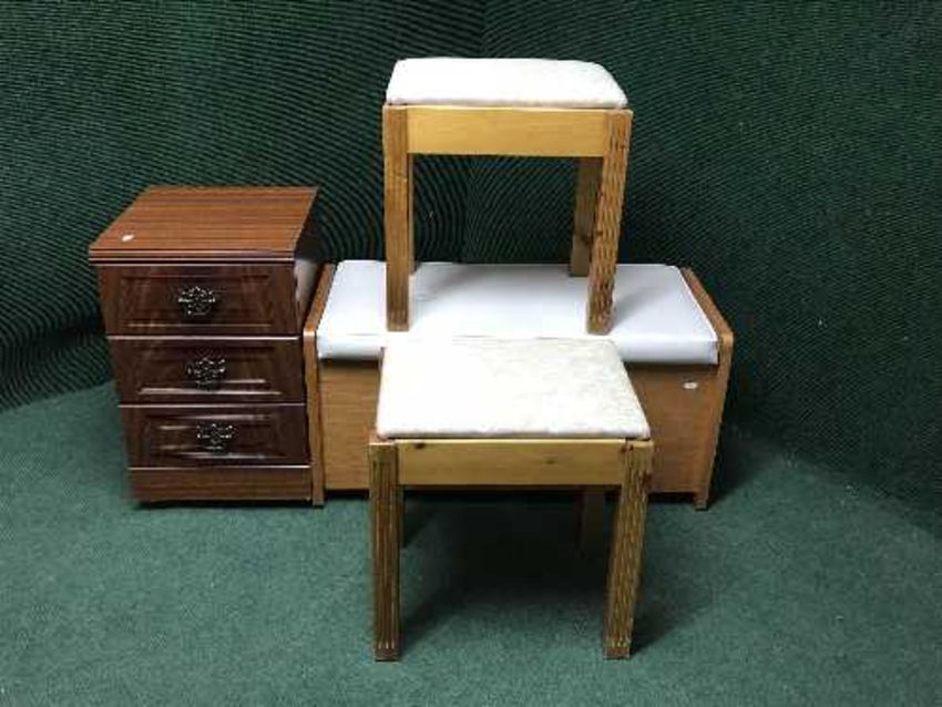 A mahogany effect bedside chest, teak blanket box and two dressing table stools