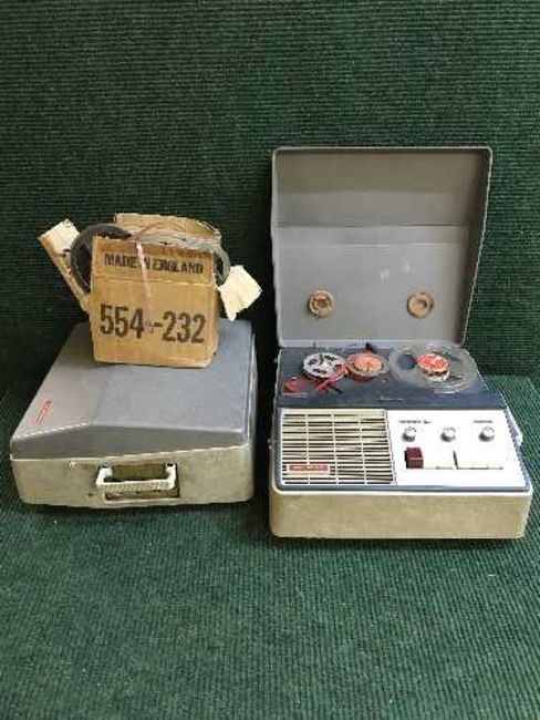A box of two Stellaphone reel to reels, Eagle Product radio, Eddystone receiver and a box of reels