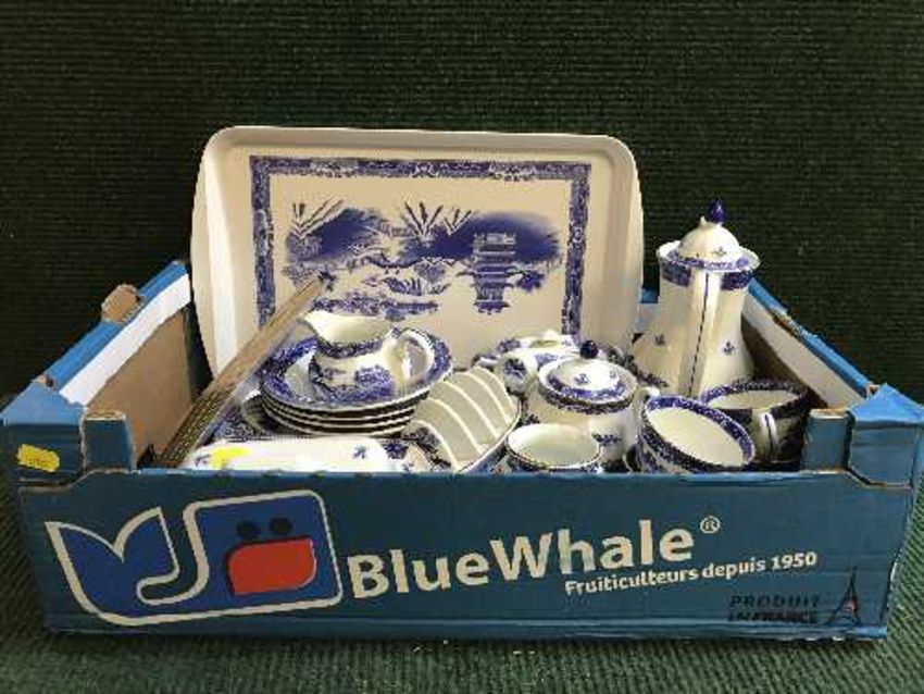 A box of Ringtons blue and white ware, mahogany framed Coulson print, mahogany arched mirror and gilt framed mirror
