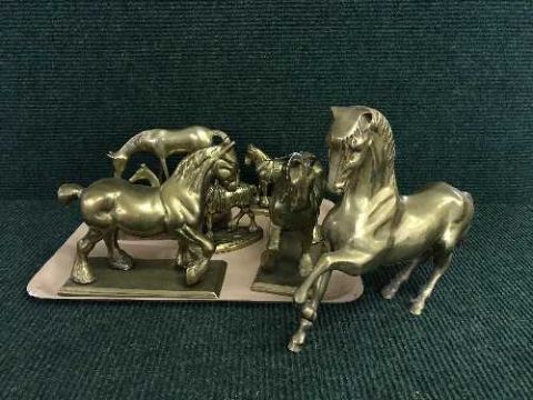 A tray of six heavy brass ornaments of horses