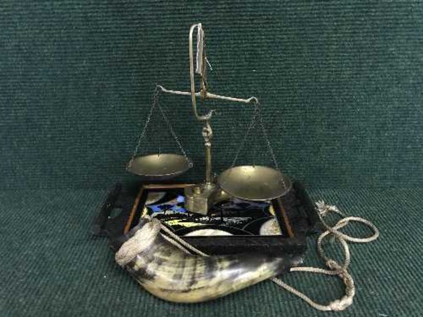 A butterfly tray, brass balance scales with weights and a hunting horn