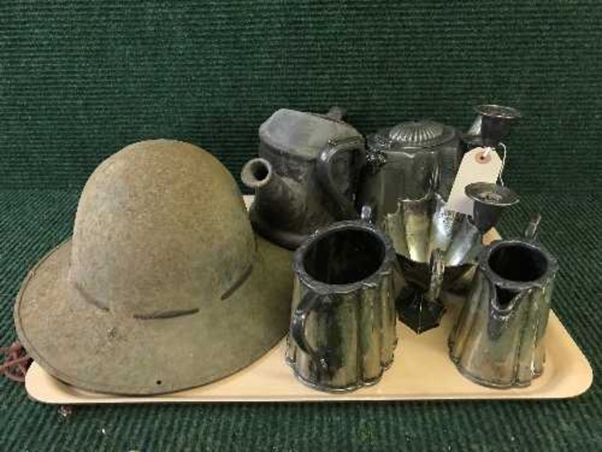 A tray of WW I helmet, plated ware, pottery watering can