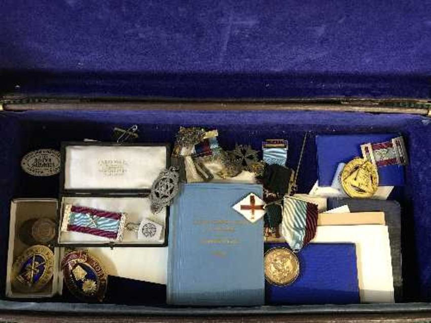A large and comprehensive collection of Masonic regalia, including aprons, cuffs, caps, gloves, medals (at least six of which are silver), jewels, booklets, certificates, tokens, Order of St John of Jerusalem, plus a Masonic sword in a leather bag