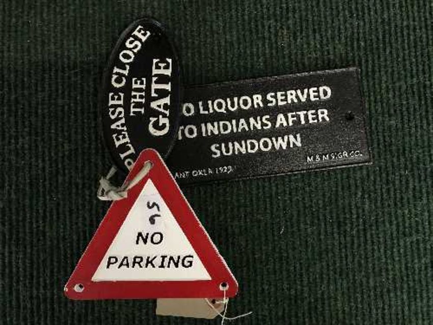 Three small cast iron plaques - No Parking, Please close the gate etc.