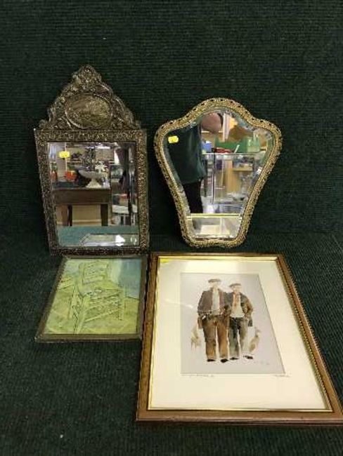 A mahogany framed signed print - Northumbrian Pit Men by T McCardle, framed print, framed copper embossed mirror and one further mirror