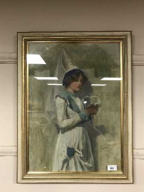 Manner of Ralph Hedley : girl in traditional dress holding a prayer book, oil on canvas, 38cm x 54cm