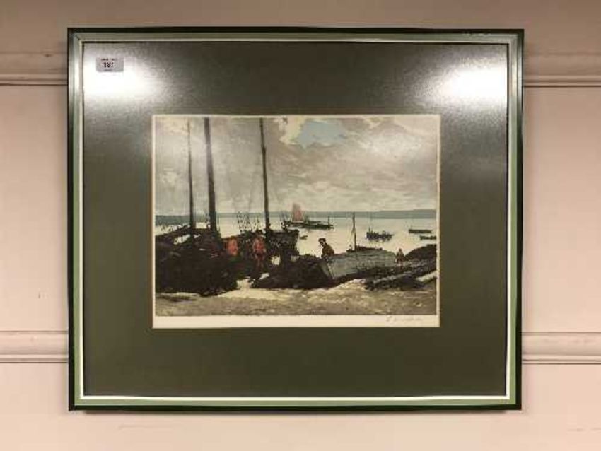 G. Marchetti : Pecheurs de Douarnenez, etching with hand colouring, signed in pencil, 41 cm x 30 cm, framed.