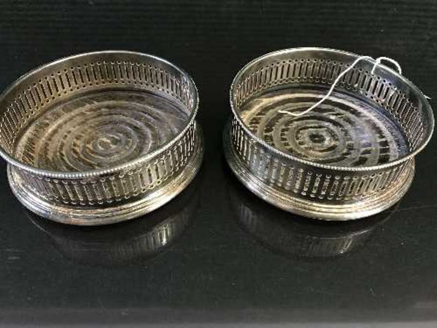 Two silver wine coasters