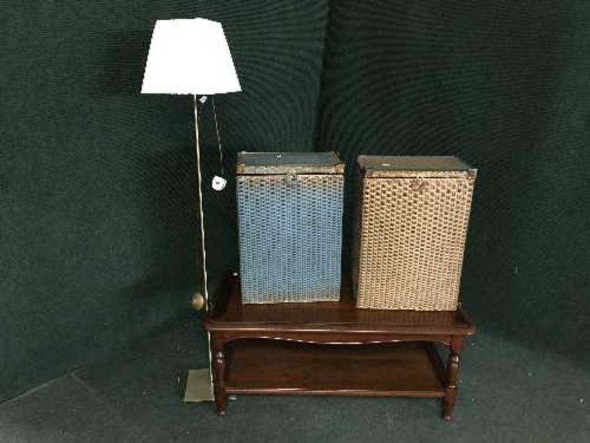 A contemporary two tier coffee table together with two Lloyd loom boxes and a standard lamp with shade