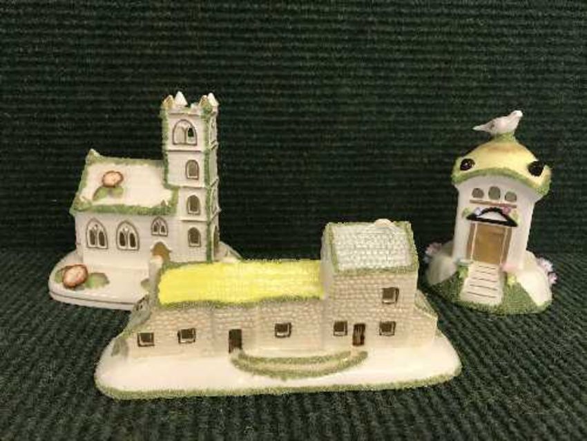 Four miniature Coalport china houses - Village church, Dovecote etc