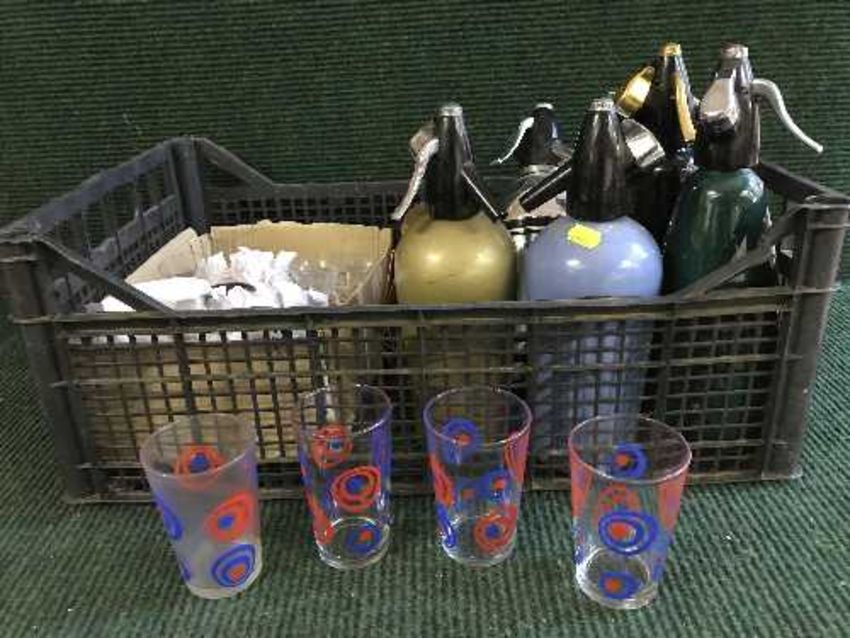 A box of glass ware and soda syphons
