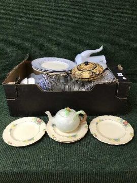 Two boxes of Royal Doulton plates, glass vases, berry spoons etc