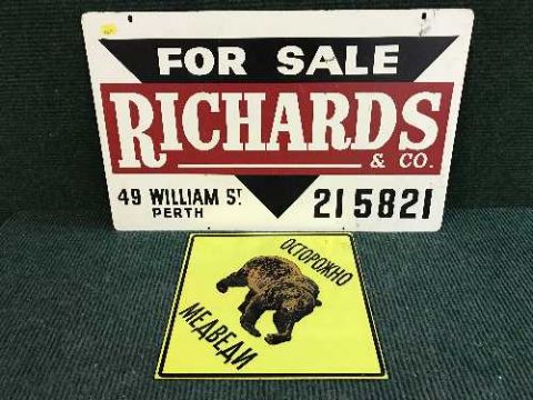 An enamelled "For Sale Sign Richards & Co" and one other sign