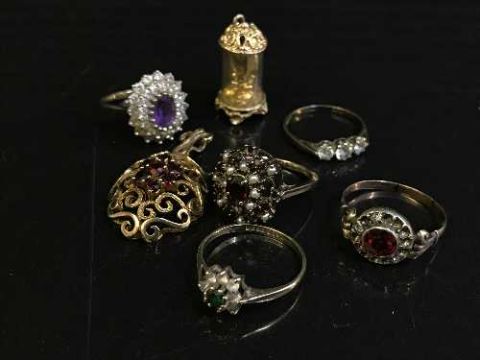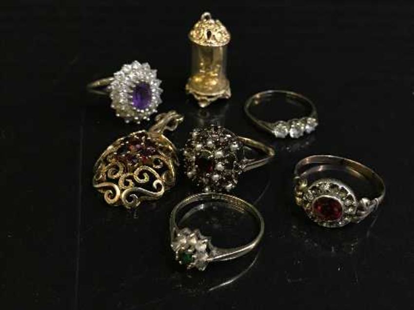 Assorted gold jewellery including five rings, a pendant and clock charm 19 grams (7)