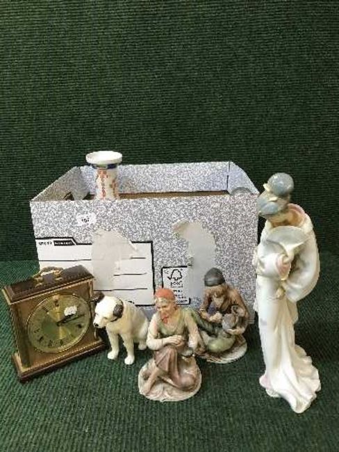 A box of mantle clock, decanter, large vase, Lladro figure etc