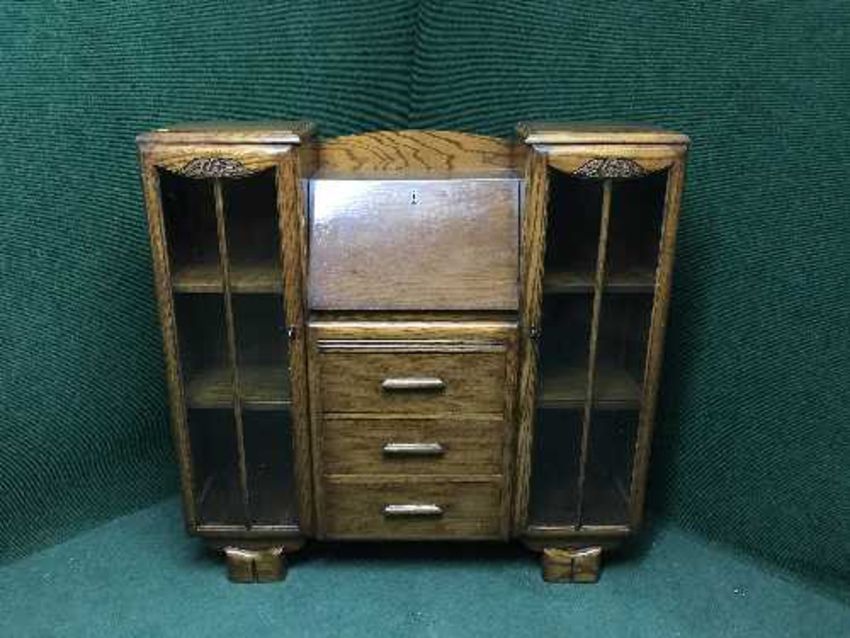 An oak glazed door bookcase with central bureau