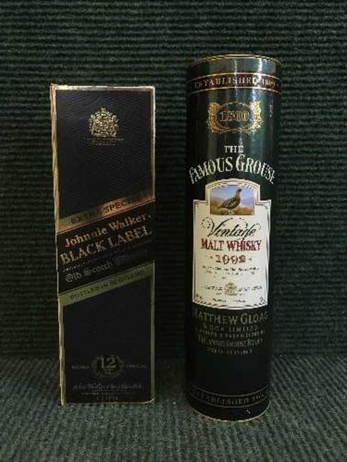 A bottle of Famous Grouse 1992 malt whiskey and a bottle of Jonnie Walker Black Label whiskey