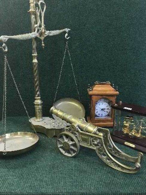 A large set of brass scales, a brass miniature cannon, a mantel clock and a cased model ship