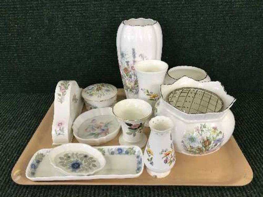 A tray of Aynsley Wild Tudor and Cottage garden china and a Wedgwood Clematis pin dish and tray