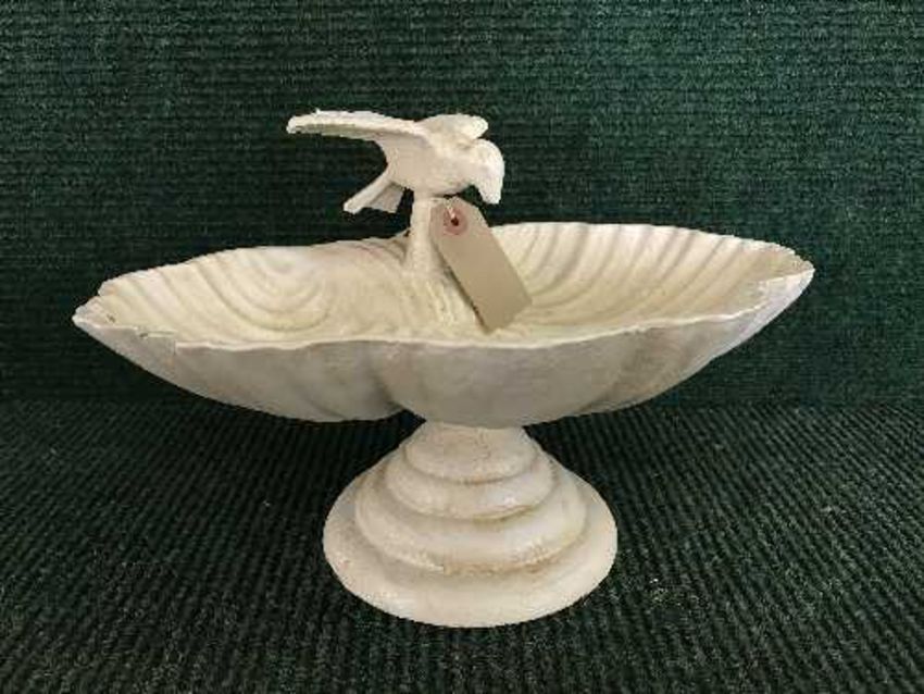 A cast metal bird bath