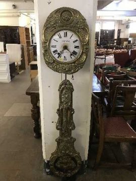 An embossed brass French wall clock by F. Bonnefoy with pendulum and weights