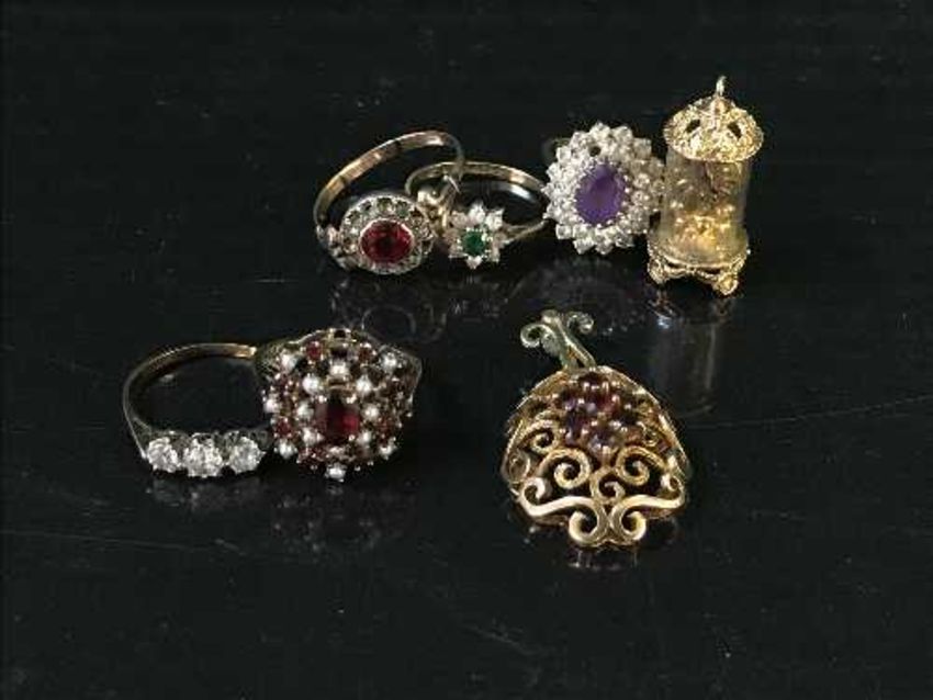 Assorted gold jewellery including five rings, a pendant and clock charm 19 grams (7)